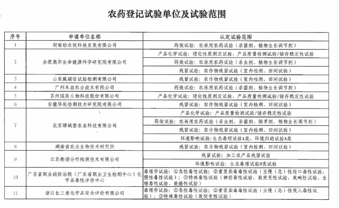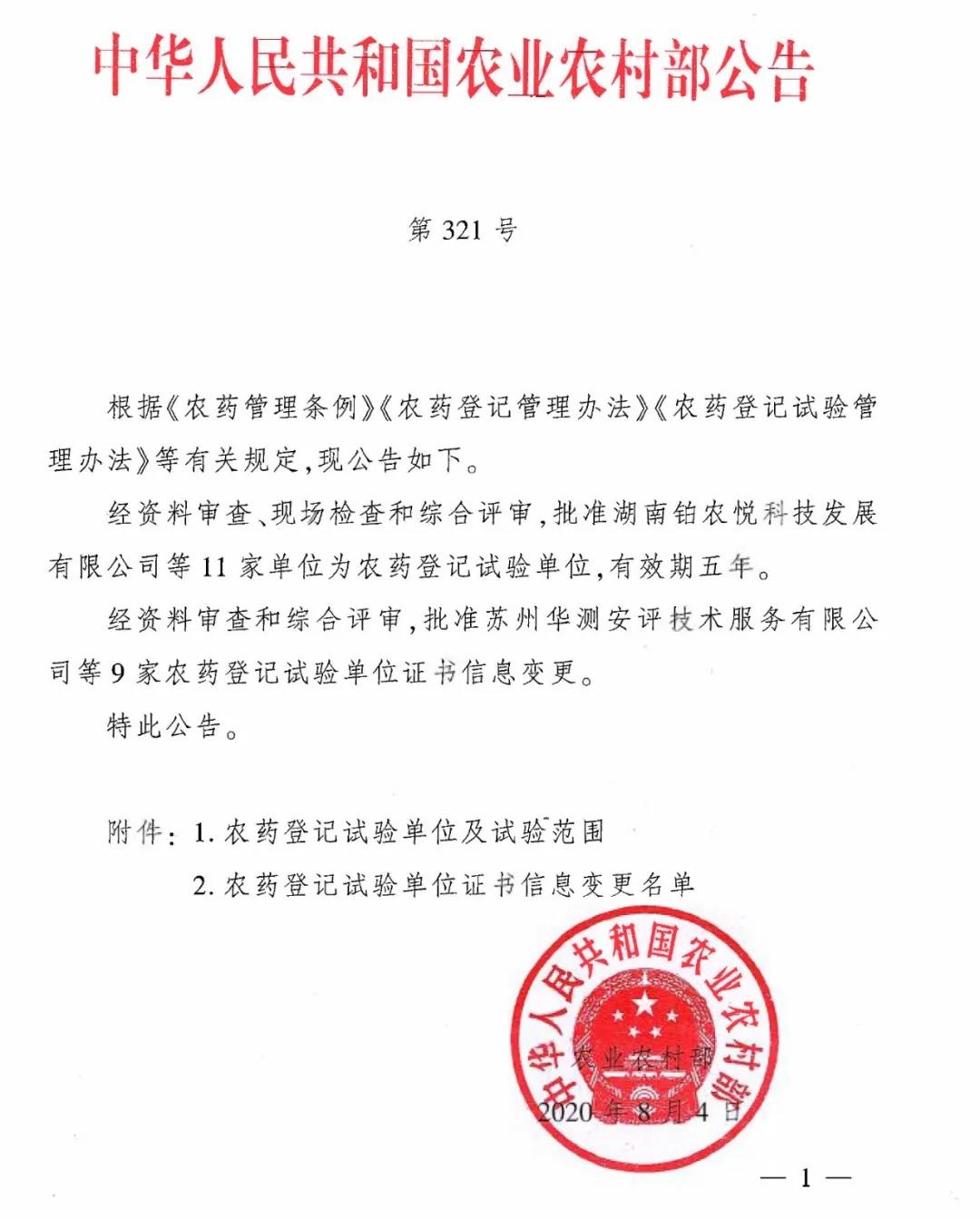 2020年8月4日,中華人民共和國(guó)農(nóng)業(yè)農(nóng)村部發(fā)布第321號(hào)公告,浙江長(zhǎng)三角化學(xué)品安全評(píng)價(jià)有限公司(簡(jiǎn)稱長(zhǎng)三角公司)被批準(zhǔn)為農(nóng)藥登記試驗(yàn)單位,有效期五年。